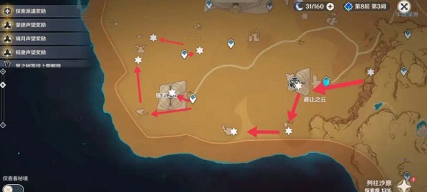 1、铄石之丘区域的草神瞳分布位置如下图所示,一共有5个;