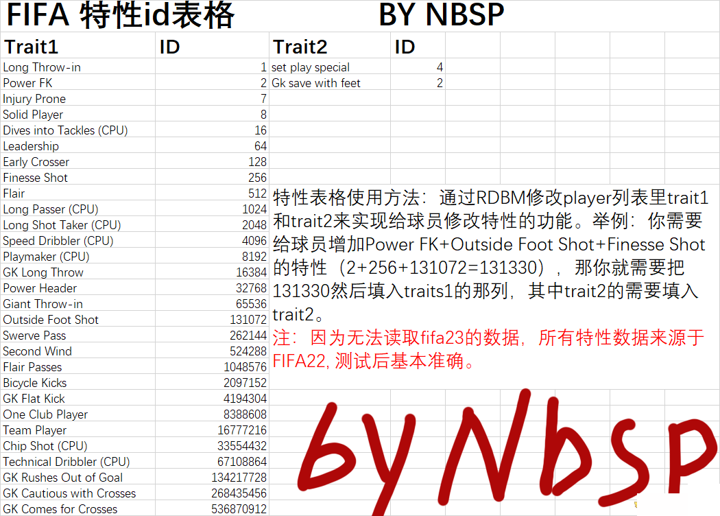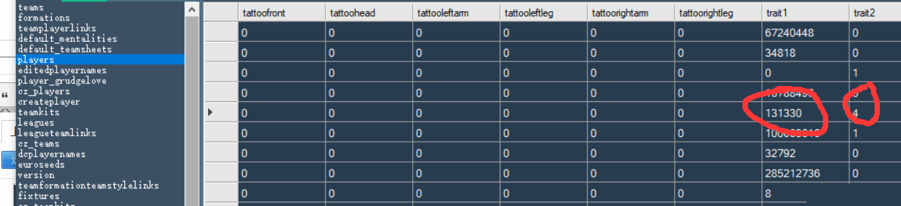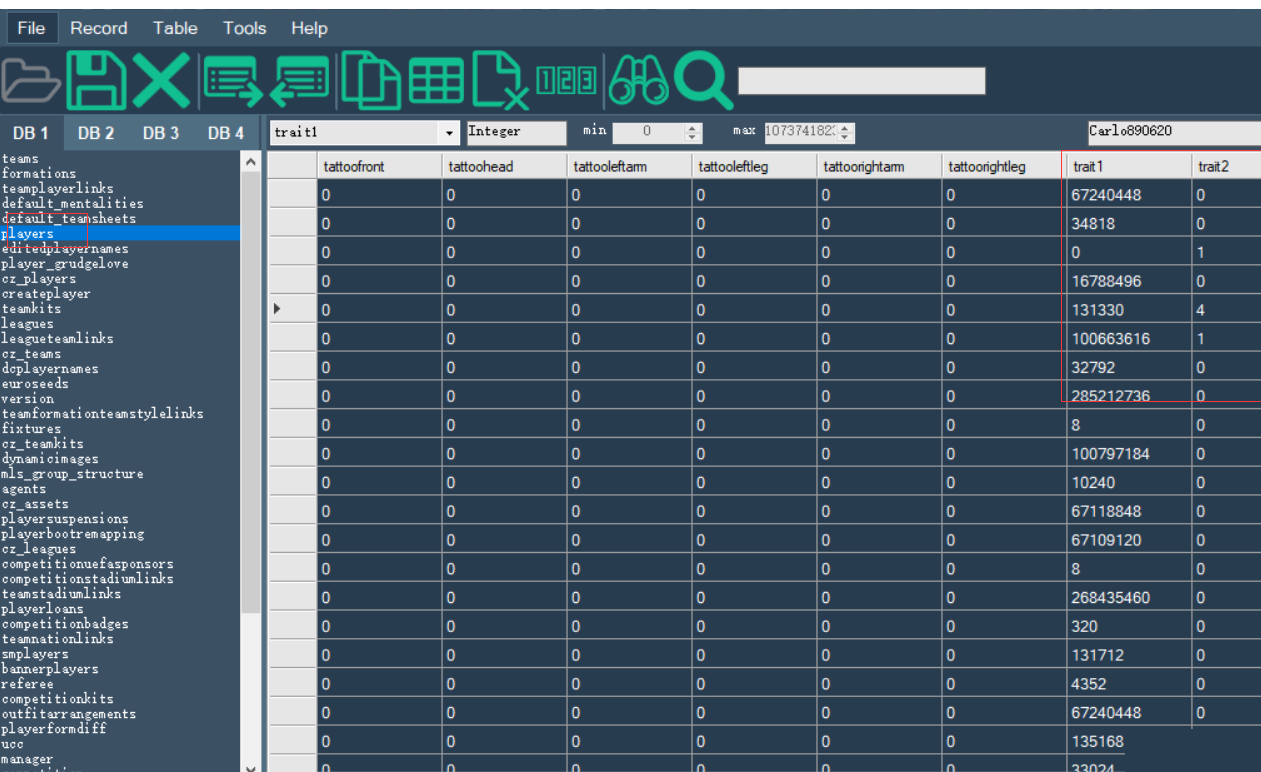 修改详细教程如下: 1、目标 修改球员特性。 2、方法 通过RDBM打开存档后,找到player表格,然后查找trait1这一列,然后根据我提供的表格填入数据(表格见下面),其中区分trait1和trait2,主要在1,举例:你需要给球员增加Power FK+Outside Foot Shot+Finesse Shot的特性(查的各特性号码相加:2+256+131072=131330),那你就需要把131330然后填入traits1的那列,其中trait2的需要填入trait2。