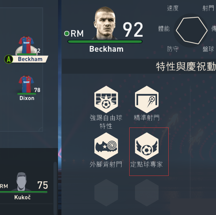 例如给贝克汉姆添加了大力任意球+外脚背+搓射以及任意球大师特性。