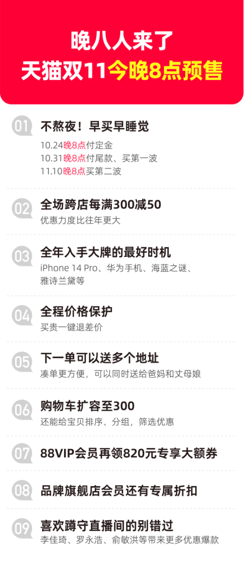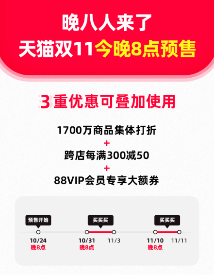10月24日晚8点,2022天猫“双11”正式开启预售。阿里巴巴集团国内数字商业板块总裁戴珊表示,今年“双11”将见证中国消费活力、创业者生命力、数字商业想象力,以及实体制造业坚韧力。同时,消费者可以将“三重优惠叠加使用:1700万商品集体打折、全场跨店每满300减50、88VIP会员再领820元大额券。