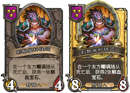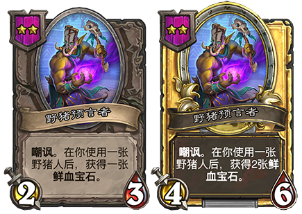 新:2点攻击力,3点生命值。嘲讽。在你使用一张野猪人后,获得一张鲜血宝石。