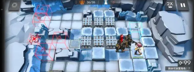 具体的摆放方法很简单,先在左下角部署棘刺,冲上攻击,等着暖机就行,然后右侧高台部署能天使冲上攻击,cost好了就部署,不用对轴什么过载技能,放就行了。