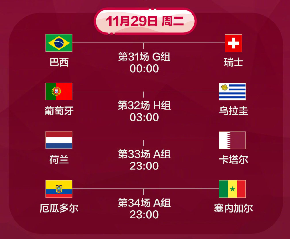 00:00巴西VS瑞士G组未开始 03:00葡萄牙VS乌拉圭H组未开始 18:00厄尔瓜多VS塞内加尔 A组未开始 21:00荷兰VS卡塔尔A组未开始