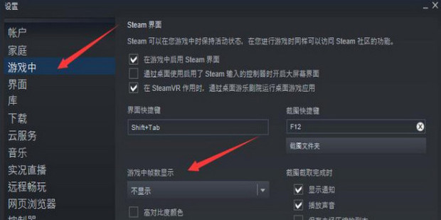 方法一: 打开Steam设置 选择游戏中 选择游戏中帧数显示一栏 下拉选择帧数显示位置即可。