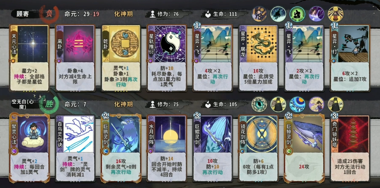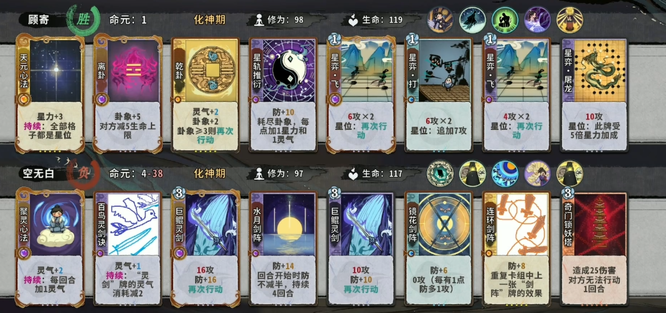 对抗大成云剑,一轮打不死对面而自己有三星乾卦时可以下离卦,提前用虚弱护体丹保住自己狗命,拖回合打伤害。活用星弈断,断可以在第二三四五回合断对面关键牌。