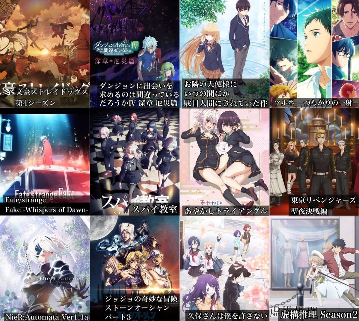 2023年一月新番 最新版 共71部! 《文豪野犬4》 《地下城邂逅4》 《弦音2》 《邻家的天使大人》 《Fate/strange Fake》 《间谍教室》 《妖幻三重奏》 《东京复仇者2》 《尼尔》 《JOJO石之海prat3》 《久保同学不放过我》 《虚构推理2》 《冰海战记2》 《极主夫道2》 《盾娘2》 《终末女武神2》 《埃及神明的日常2》 《枪神》新作 《魔王学院的不适合者2》 《万事屋斋藤、到异世界》 《LUPIN ZERO》鲁邦三世少年版新作