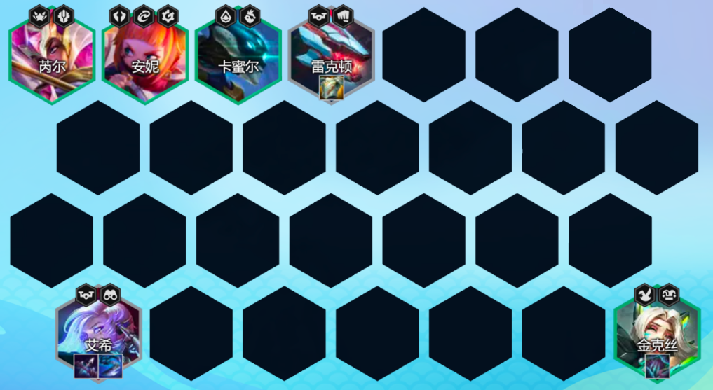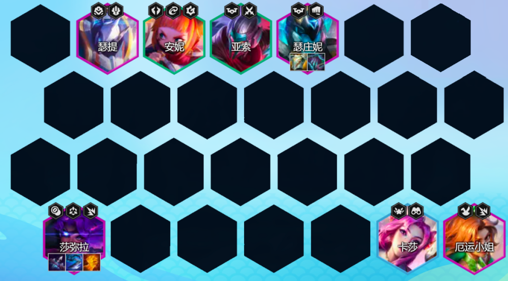 1.阵容分析 阵容组成:安妮、卡莎、厄运小姐、瑟庄妮、莎弥拉、瑟提、艾克、莫德凯撒 羁绊组成:无 新赛季卓尔不群这个符文依然被保留了下来,还是增加无羁绊的棋子的血量与攻速,这赛季能C且比较吃攻速的棋子较多,在阵容强度上比上赛季的上限会高出许多。