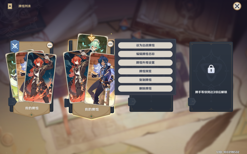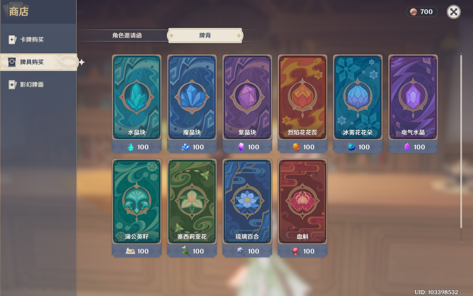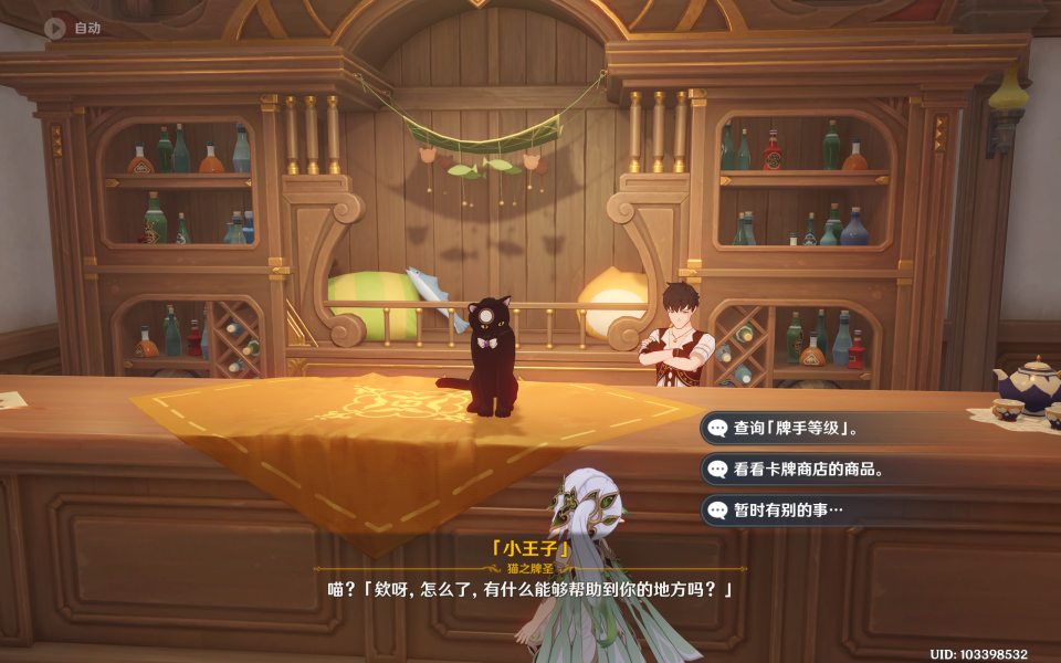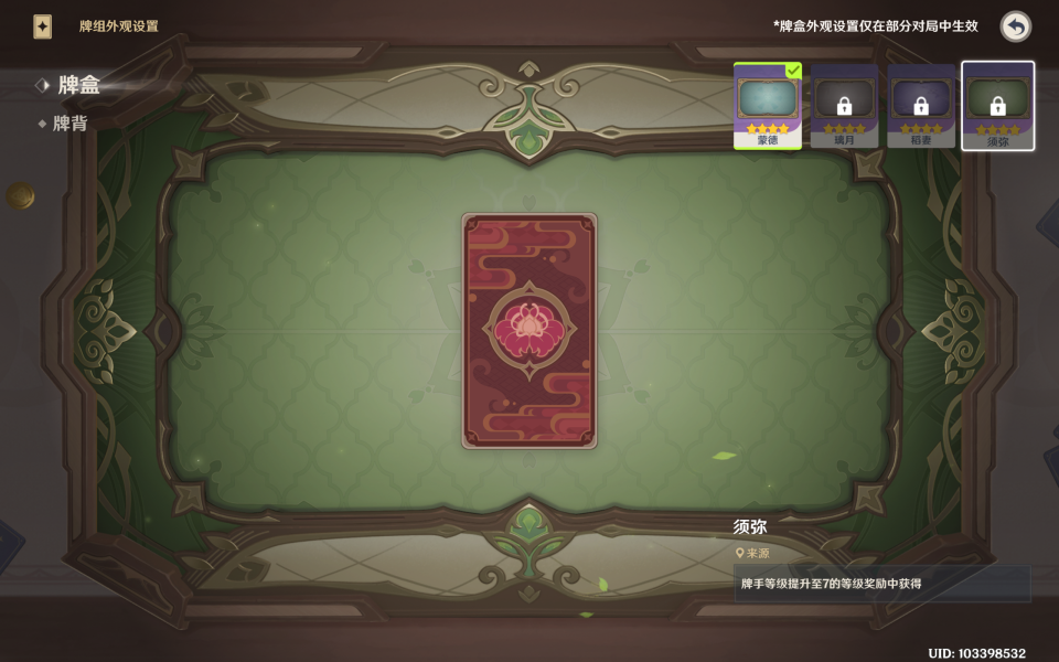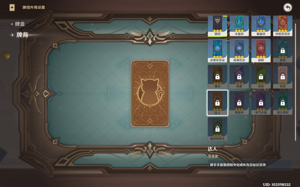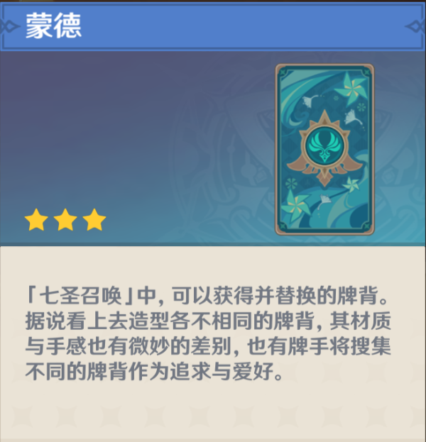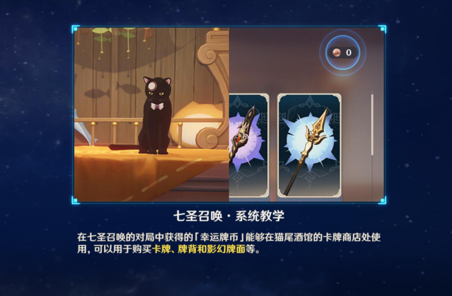 换卡背方法:牌组上有3个点那里面 手册只有当你在猫尾酒馆的时候,在右上角能看到 牌手手册在右上角那一排图标里 过七圣召唤引导任务,会给一个棕色的牌盒(小道具),如果没有的话应该是你的这个任务没做完(斯万、砂糖、菲谢尔可能有几个没打完),任务过完的话应该是在活动的左边(快捷入口) 可兑换牌背获取:完成新手任务,解锁猫尾酒馆NPC「小王子」即可。