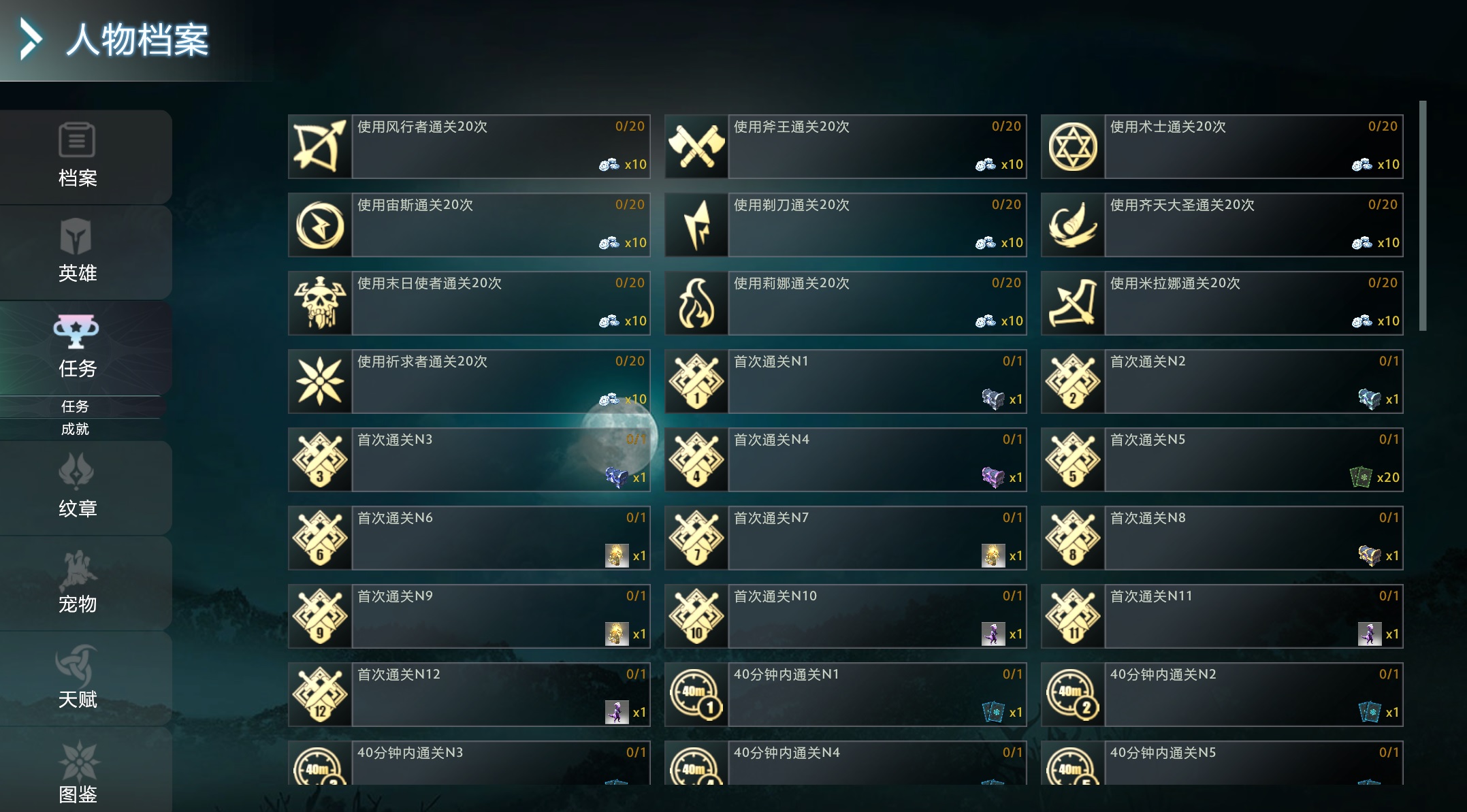 8. 左上角有商城和人物档案,玩家可以查看任务、点击天赋、查看宠物纹章等道具,每个任务都有奖励,完成后可以领取,玩家可以抽取卡池获取英雄、宠物等道具提升自己。