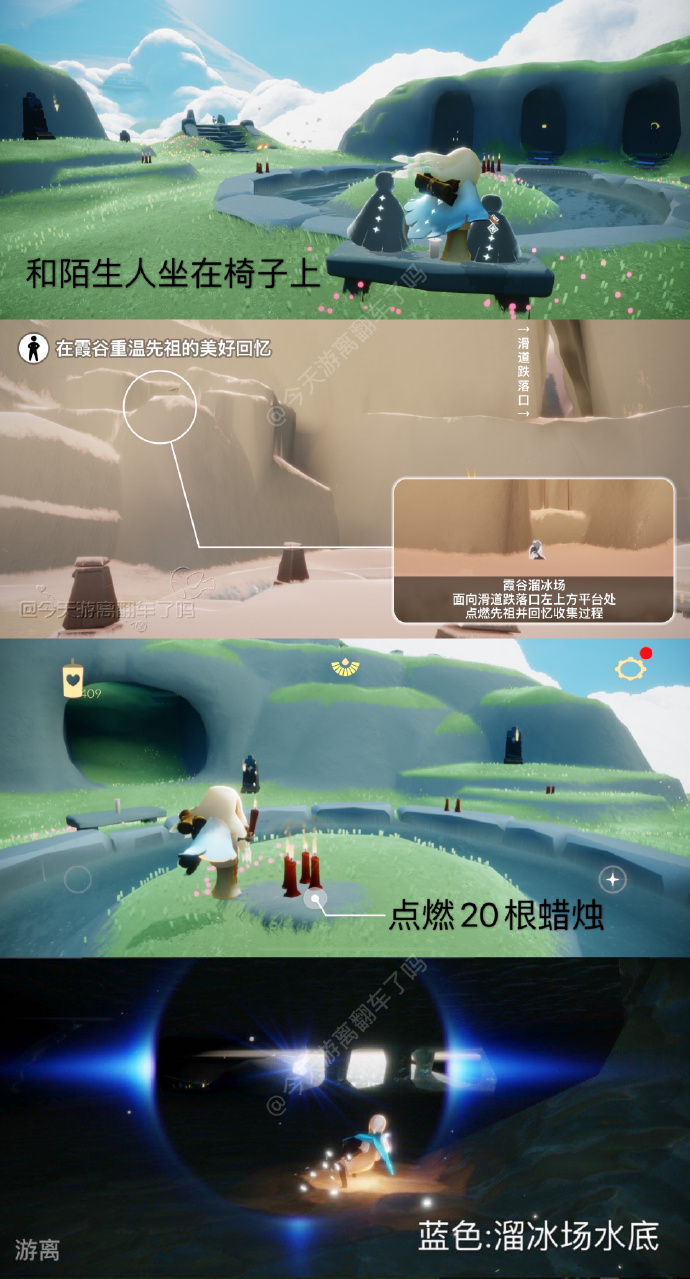 「和陌生人坐在长椅上」字面意义 「在霞谷重温先祖的美好回忆」霞谷跌入溜冰场前右手边悬崖 「点燃20根蜡烛」 「收集蓝色光芒」霞谷溜冰场水底