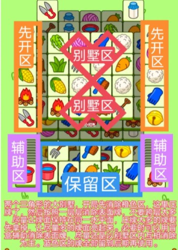 1.今天主要消除的地方在红色区,里面有两个大别墅。 2.开局先消除橙色区的牌,这里压牌了,尽量要让牌面保持在同一水平面,然后一层一层消除表面牌,不要跨层太多拿牌,等表面牌消除完后,以大别墅内互相消除为主。 3.必要时可以用紫色盲盒区辅助消除,盲盒区后期不用留太多,留几张备用即可。 4.蓝色区能不动就不动,里面基本都是明牌,一定要保留到最后使用。