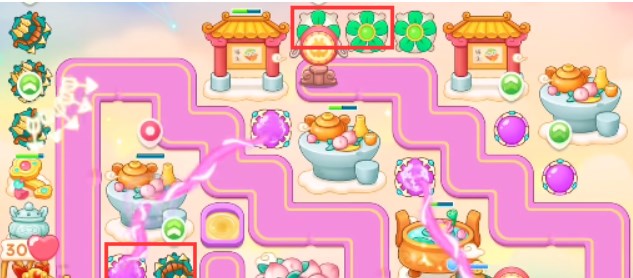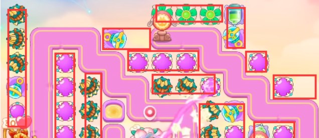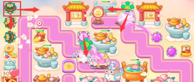 1、本关能够使用的炮塔是:毒针、风扇、魔法球、多重箭、泡泡塔,这一关我们用多重箭风扇和魔法球玩。