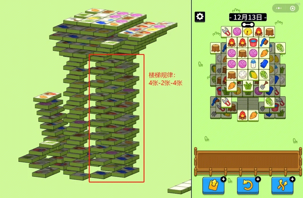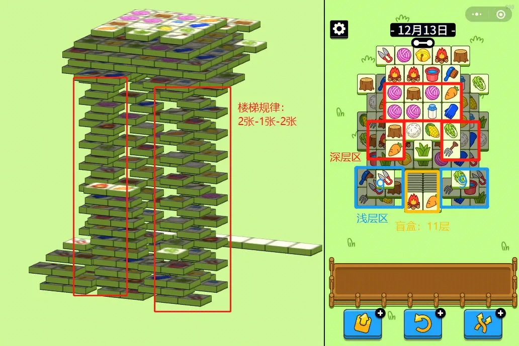 ① "主攻区"(深红线) 向中心消出主区后, 四区互消 ② "保留区"(橙黄框) 今天留牌不多, 中后期再使用 ③ "盲牌区"(浅紫框) 露出主区前, 用1/3或一半的牌