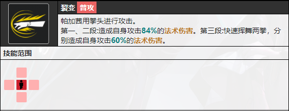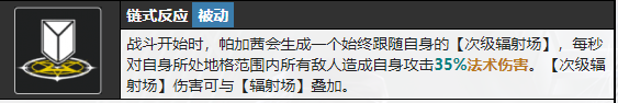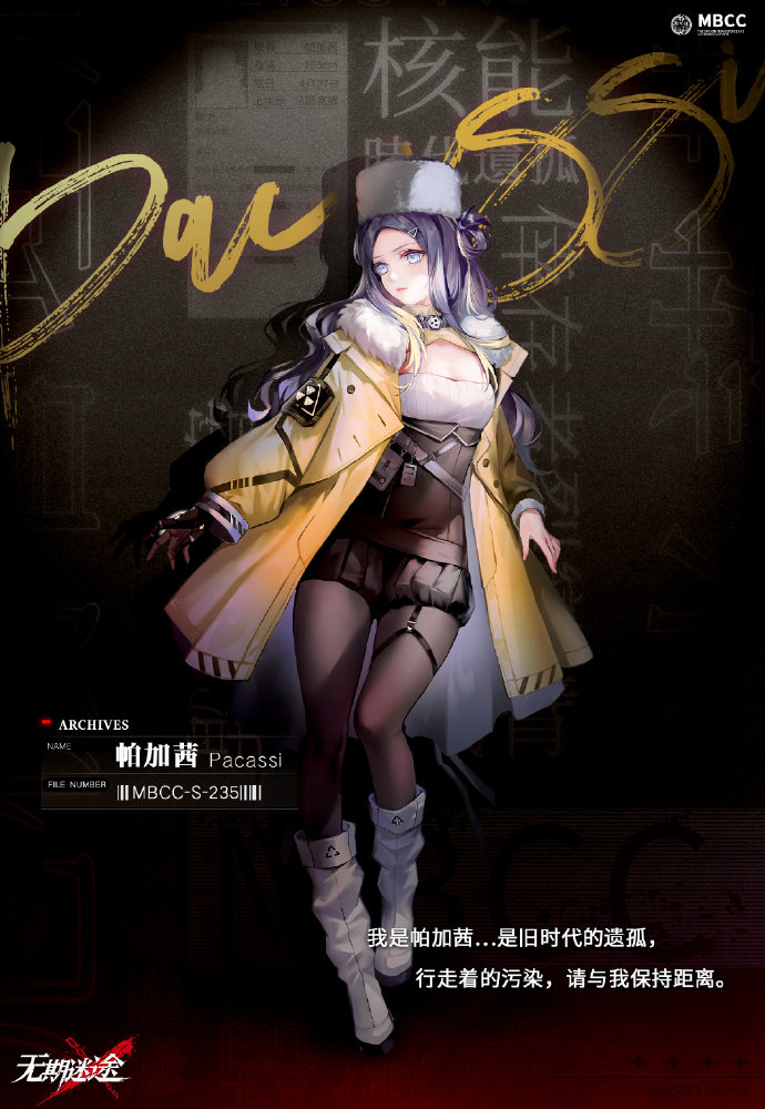 禁闭者档案 ■狂暴特化 Fury Tendency 「我是帕加茜…是旧时代的遗孤,行走着的污染,请与我保持距离。」 *条目I:来自偏远他乡的新能源载体,体内存储超额核能,频繁对外界释放危险辐射,曾有毁灭一整个马耶克镇的灾害记录。 *条目II:对狄斯缺乏归属感,需进行隔离管制,以防对社会造成毁灭性危害。 *条目III[已解锁]:异能名称【核能辐照】。体内贮存大量核能,能依照意愿发射致命剂量的放射物质。机械右臂在核能加持下,可作强力武器。 ■查阅权限 [已解锁] 「我是帕加茜…是旧时代的遗孤,行走着的污染,请与我保持距离。」 「还是没放弃吗......那就,触碰我吧..……做好被辐射贯穿的准备。」 技能介绍: