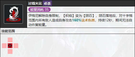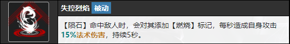禁闭者档案 ■异能特化 Arcane Tendency 「在这儿就不用有所顾忌了。」 * 条目I:大规模连环纵火案肇事人,早年就曾在新城数个居民区引发过多起失火案件,造成多人受伤与巨大财产损失。 * 条目II:在暴乱中擅自脱离收容,在新城短暂停留后又主动自首,原因不明,恐存在一定安全隐患。 * 条目III[已解锁]:异能名称【火焰操控】。能使周身半径十米内的各种物质瞬间自燃,在情绪激动时此能力会脱离理性控制,造成大范围、难以扑灭而破坏力极大的烈火。 ■查阅权限 [已解锁] 「我不会再输给它了。从今以后,由我来命令火焰。」 「离我远点儿!烫伤了我可不出医药费。」 技能介绍