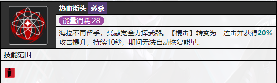 禁闭者档案 禁闭者MBCC-S-098 海拉 ■狂暴特化 Fury Tendency 「我?装可爱?谁说的?!人家难道不可爱吗?」 *条目I:混迹辛迪加的贫民少女,早年靠盗窃和诈骗为生,前科累累。 *条目II:而后进入地下机构帕尔马实验室,涉嫌参与一系列非法人体实验项目。被MBCC收容后,海拉始终拒绝配合调查。目前怀疑海拉有同伙,即帕尔马实验室还存在另一名涉案禁闭者。 *条目III[已解锁]:异能名称【自愈再生】。对象体细胞及神经系统受到不明药物及异能双重影响,肌肉、结缔组织修复速度达到一般人的数万倍至十数万倍,可在数秒内修复巨量损伤。 技能介绍