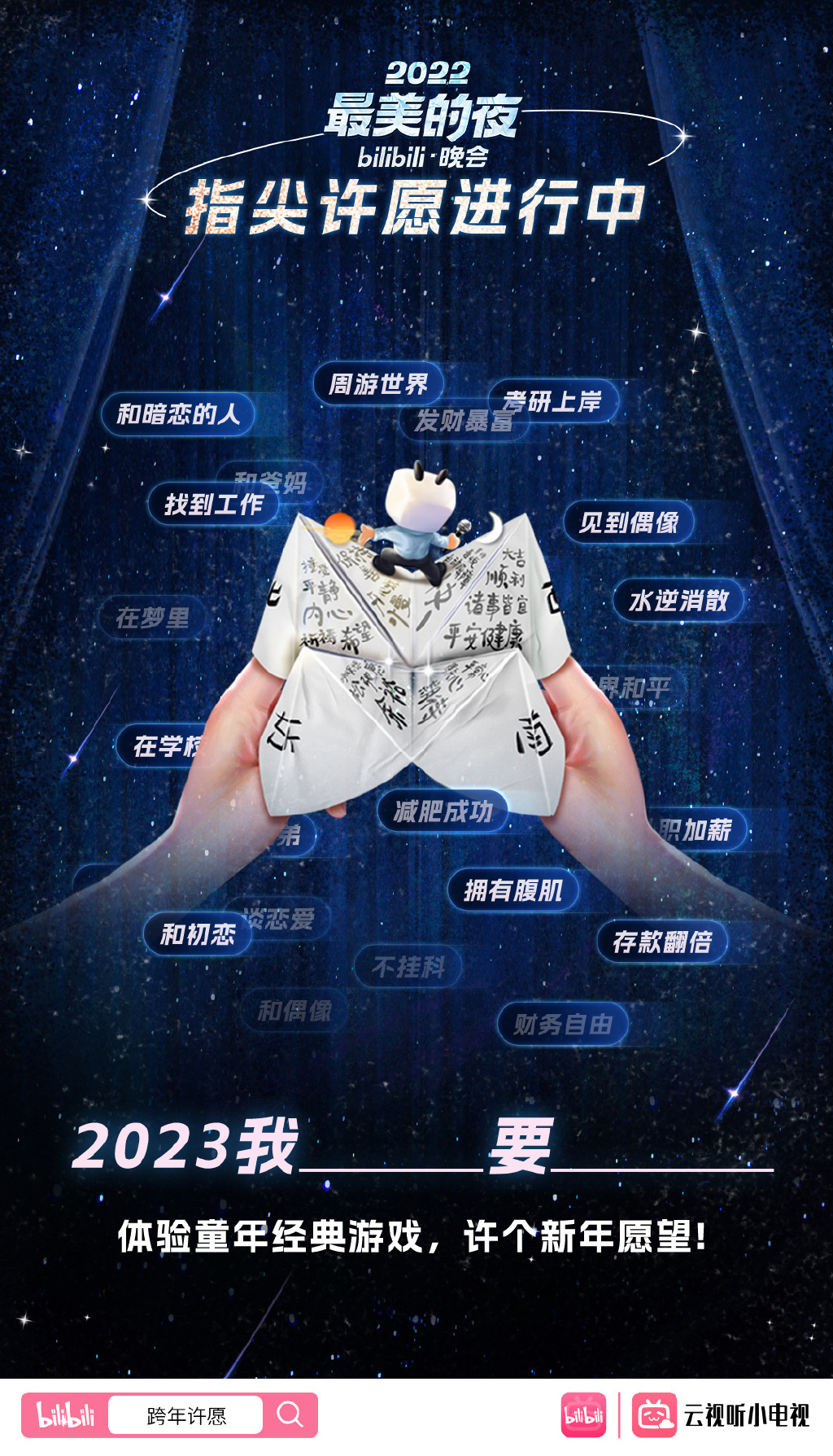 在跨年时刻怎能少了许愿!来B站,带你解锁最复古的许愿姿势~还记得小时候风靡一时的东南西北吗?许个愿望、动动手指,揭晓2023你的新年关键词! 在指定时间内许愿成功,还可解锁2022最美的夜跨年晚会0点专属弹幕彩蛋哦!快来试试吧! 快来试试吧>> 手机入口:O网页链接 PC入口:O网页链接