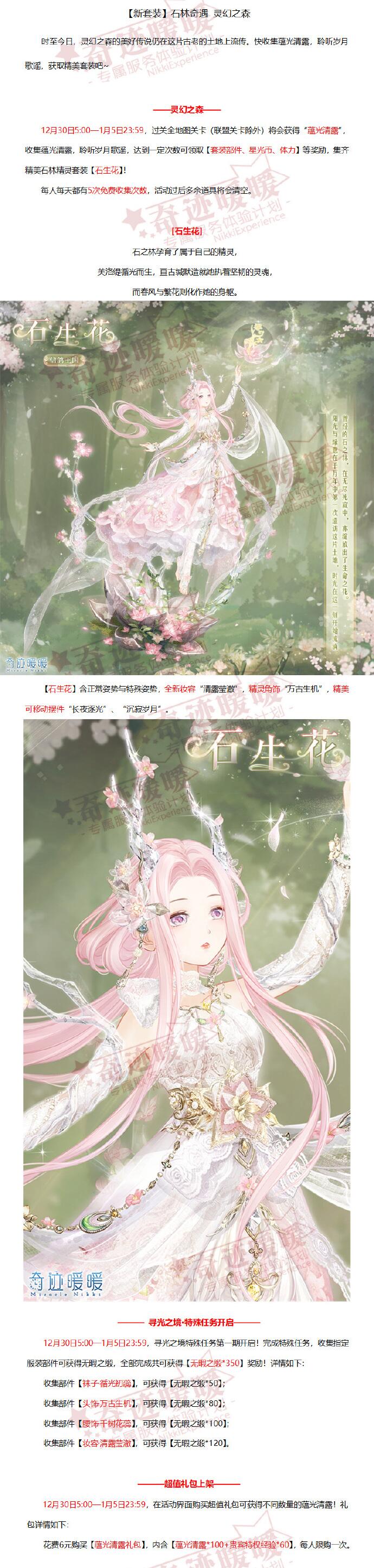 活动时间:12月30日5:00-1月5日23:59 在活动期间,通关除联盟关卡外的全地图关卡,将会获得蕴光清露 收集蕴光清露,聆听岁月歌谣达到一定次数可以领取套装部件等奖励,每人每天有5次免费机会 具体活动规则及套装见下图 图源微博id:奇迹暖暖傲娇攻略组