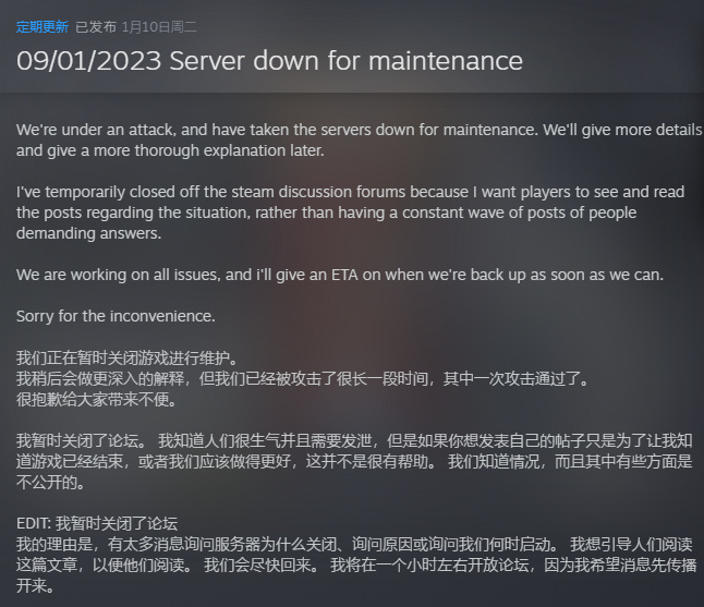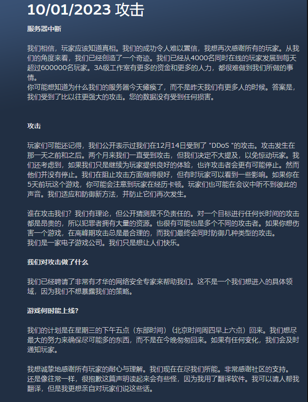在昨晚《鹅鸭杀》服务器再次宕机后,官方于昨日和今日分别发布公告,对此作出说明: 《鹅鸭杀》服务器已经经历了大约两个月的攻击,加上高玩家数量(60万同时在线人数),让服务器不堪一击。在昨晚再次遭遇了一次大规模攻击后,官方关闭了服务器,将对其进行维护和加固,玩家的所有数据均未受到破坏。 官方已经聘请了非常有才华的网络安全专家来进行协助,按照计划,服务器将于美国东部时间周三下午5点(北京时间周四早上6点左右)重新开放。官方表示自己正在尽一切努力,感谢所有玩家的耐心和理解。