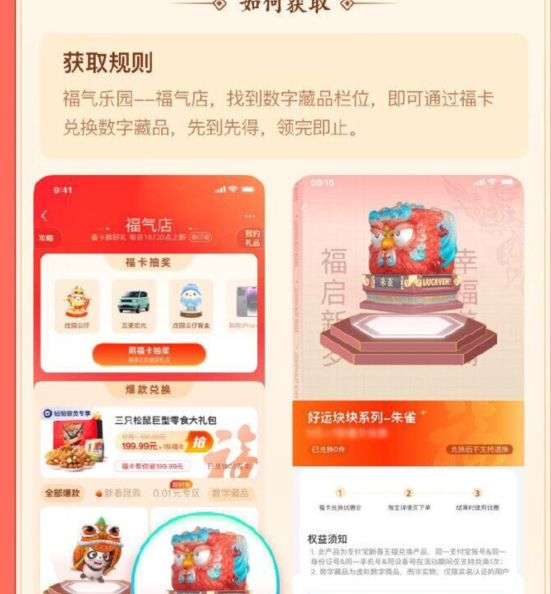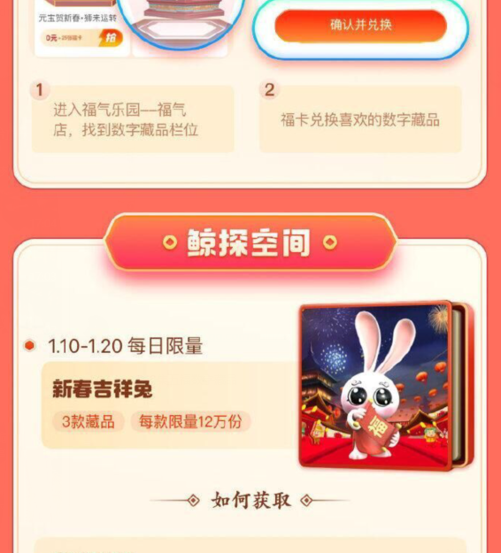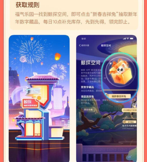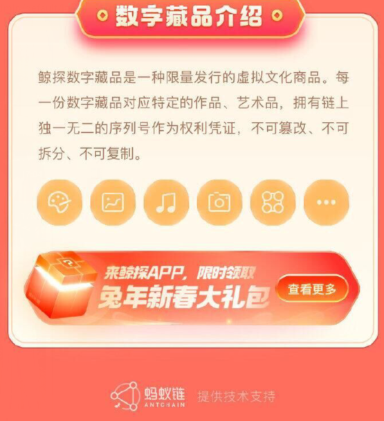 主办方将用户创作的年画作品提供予鲸探平台用于在蚂蚁链生成年画数字藏品,用户在点击领取年画数字藏品后,系统将向用户对应的支付宝账号发放数字藏品,用户可在“鲸探”进入“我的藏品”查看年画数字藏品的详细内容。活动时间为2023年1月10日00:00:00至2023年1月21日22:00:00。