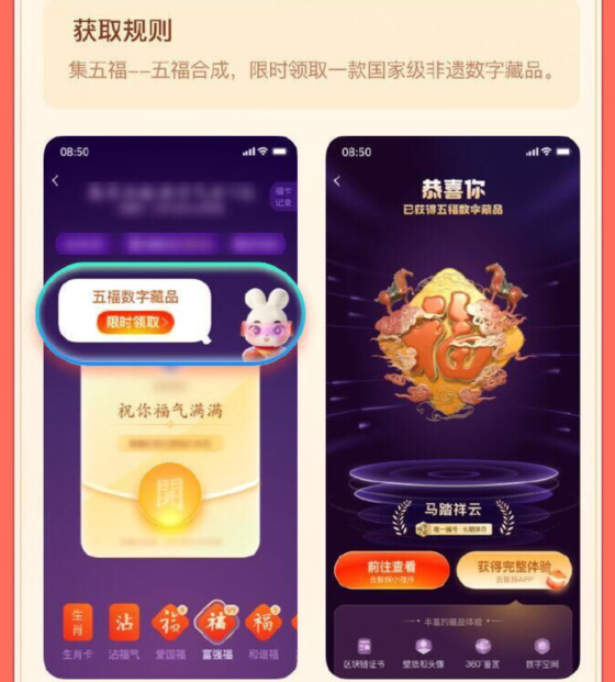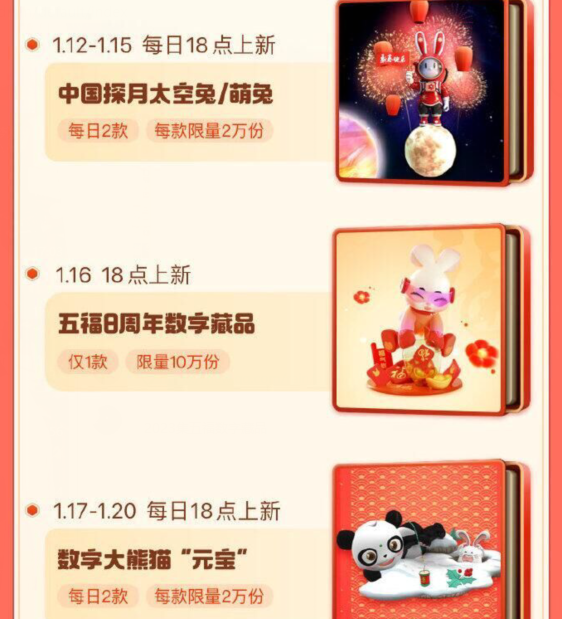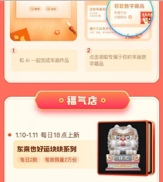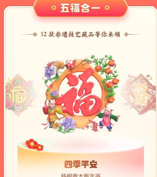 支付宝推出“2023集五福-AI年画”数字藏品领取活动,用户可以基于主办方提供的年画原始素材,包括但不限于福兔图片以及所有的装饰元素创作多幅福兔年画,并可以选择其中一张年画作品定制和生成一份兔年五福新春年画数字藏品。