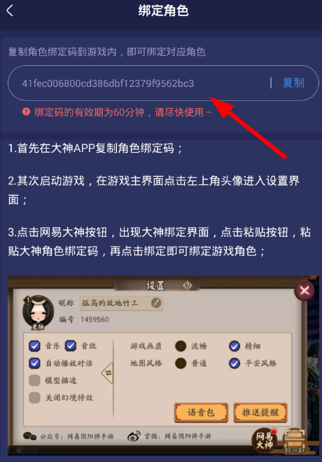 4、无法检测绑定,原因可能是角色属于渠道服,这就需要大家在此处复制角色绑定码,从游戏里打开设置界面,粘贴即可完成绑定。