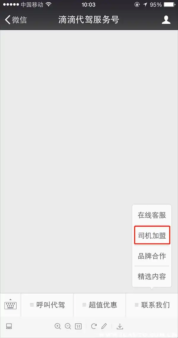 2. 公众号主页下方栏点击“联系我们”,看到“司机加盟”并点击进入;
