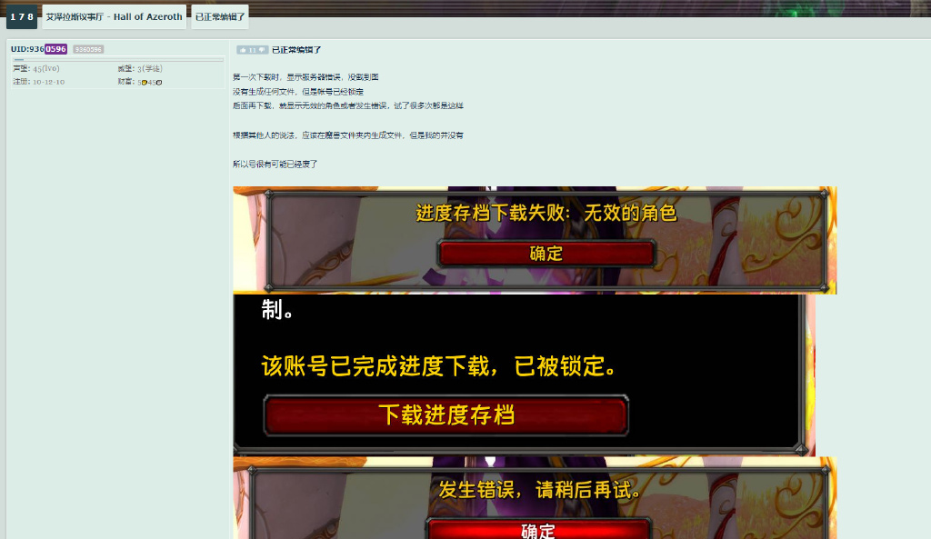 有玩家反应今日上线的魔兽“骨灰盒”功能存在bug,部分玩家出现下载存档错误后,账号被锁定的情况,根据昨日“暴雪中国说明” 该功能为暴雪开发。