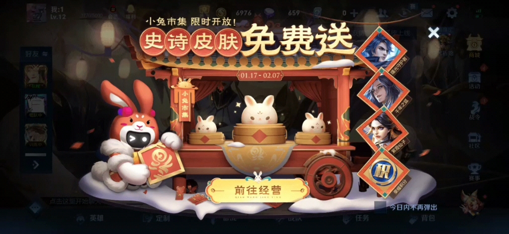 5、除夕大放送:1月21日除夕当日,登录即可领取6000小兔币,可在小兔礼盒中进行10次奖励刷新;同时1月21日起将解锁皮肤卡的领取资格。