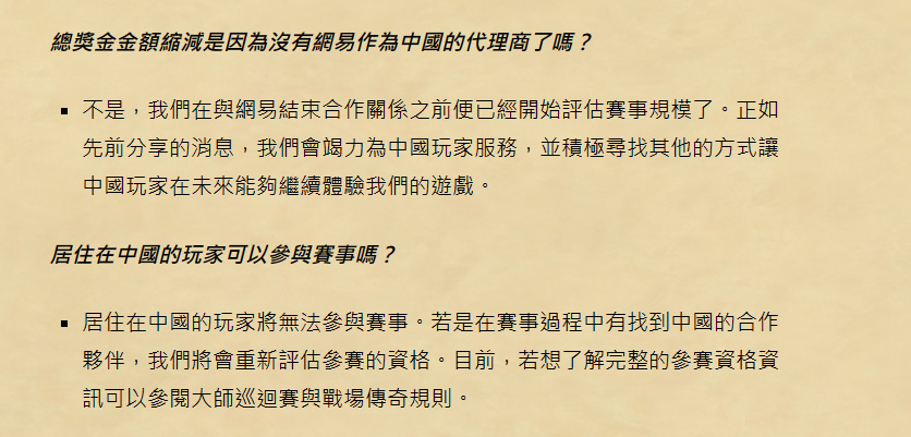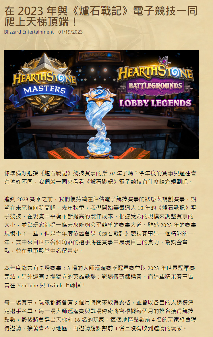 《炉石传说》官方公开了2023年炉石赛事的比赛规则,其在公告页下的常见问题处写道:中国大陆玩家无法参与该赛事 《炉石传说》公开2023年的赛程安排及参与规则。 末尾的QA处提到,中国玩家将无法参加炉石赛事,但如果在赛事过程中寻找到新的国服代理,则会重新评估中国玩家参赛的资格。
