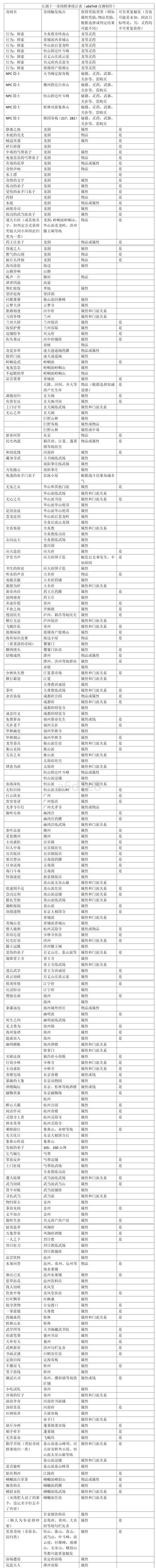 隐士和灵药的位置:只看图内前12条即可。后面的内容全部是奇闻轶事。 奇闻轶事跟任务、秘宝、武功秘籍、神兵利器基本没有任何关系。 加的属性,获得的物品,虽然根据选择看似有很多种花样,但是都是可替代的。