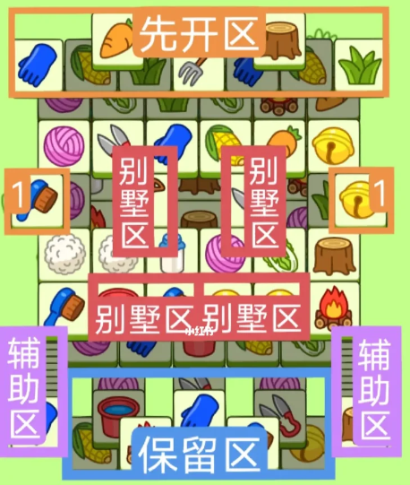 【普通关卡】 1.今天主要消除的地方在红色区,里面是一个工字型大别墅,一个三角形大别墅。 2.开局先消除橙色区的牌,这里压牌。尽量要让牌面保持在同一水平面,然后一层一层消除表面牌,不要跨层太多拿牌,等表面牌消除完后,以大别墅内互相消除为主。 3.必要时可以用紫色盲盒区辅助消除,盲盒区后期不用留太多,留几张备用即可。 4.蓝色区能不动就不动,里面的叠牌不多,一定要保留到最后使用。