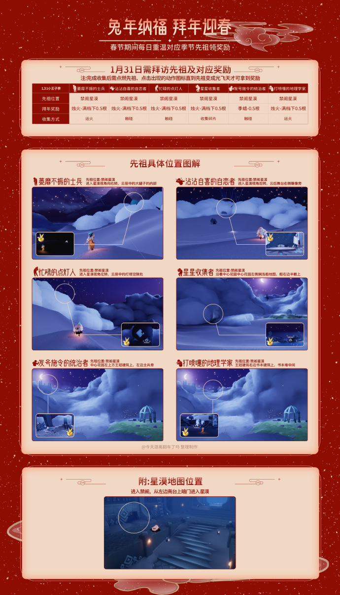 今日共六个先祖可拜访,每拜访一个先祖都能拿到一份对应的奖励。 收集完需要点火!要完整的走一个收先祖流程看着先祖飞天。 奖励是即时到账的,最好看到有奖励了再走 罐子-萎靡士兵 →烛火(3箭头0.5根) 舞台-虚荣→烛火(3箭头0.5根) 灯柱-点灯人→烛火(3箭头0.5根) 搁浅船-星星收集者→烛火(3箭头0.5根) 王冠-国王 →0.5季蜡 书本-打喷嚏→烛火(3箭头0.5根) 具体位置见下图