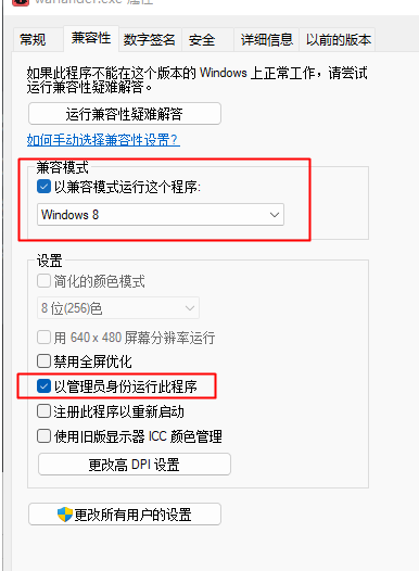 2. 右键warlander.exe属性,打开兼容模式(我朋友都是兼容win8)和总是以管理员身份运行,应用。
