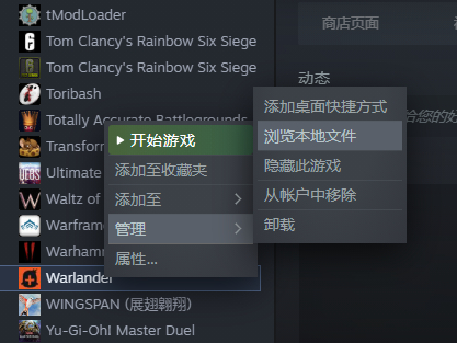 1. 打开warlander的本地文件夹,steam是右键-管理-浏览本地文件。