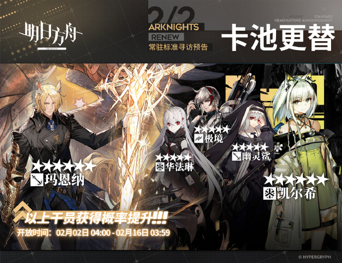 起止时间:2月2日04:00 ~ 2月16日03:59 寻访说明:常驻标准寻访更新,该寻访中以下干员获得概率提升; ★★★★★★:玛恩纳 / 凯尔希(占6★出率的50%) ★★★★★:华法琳 / 极境 / 幽灵鲨(占5★出率的50%)