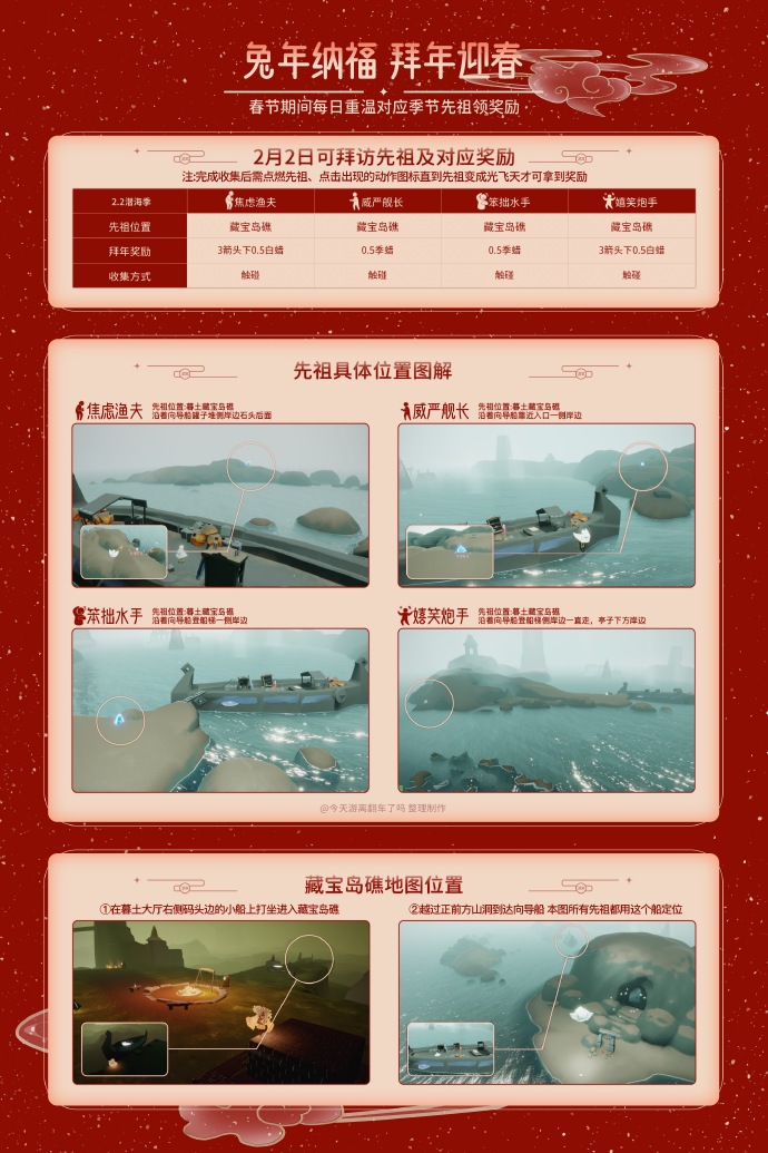 今日共四个先祖可拜访,每拜访一个先祖都能拿到一份对应的奖励。 收集完需要点火!要完整的走一个收先祖流程看着先祖飞天。 奖励是即时到账的,最好看到有奖励了再走 渔夫 →烛火(3箭头0.5根) 舰长 →0.5季蜡 水手 →0.5季蜡 炮手 →烛火(3箭头0.5根) 具体位置见下图