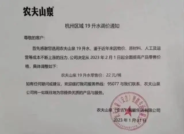 近日,一则涨价通知,让农夫山泉成为了外界关注的对象。 根据通知,农夫山泉上调了杭州市部分规格桶装水售价,涨幅10%。此前,农夫山泉也曾在上海地区对桶装水进行提价。 农夫山泉此次涨价会波及到其他城市吗?瓶装水也会加入其中吗? 最开始在业界流传的是一张农夫山泉《杭州区域19升水调价通知》,《通知》显示,因物价、原材料、人工及运费等成本不断上涨,2月1日起,杭州市19升桶装水价格调整为22元/桶。据悉,此前,杭州市19升农夫山泉桶装水的售价为20元/桶。