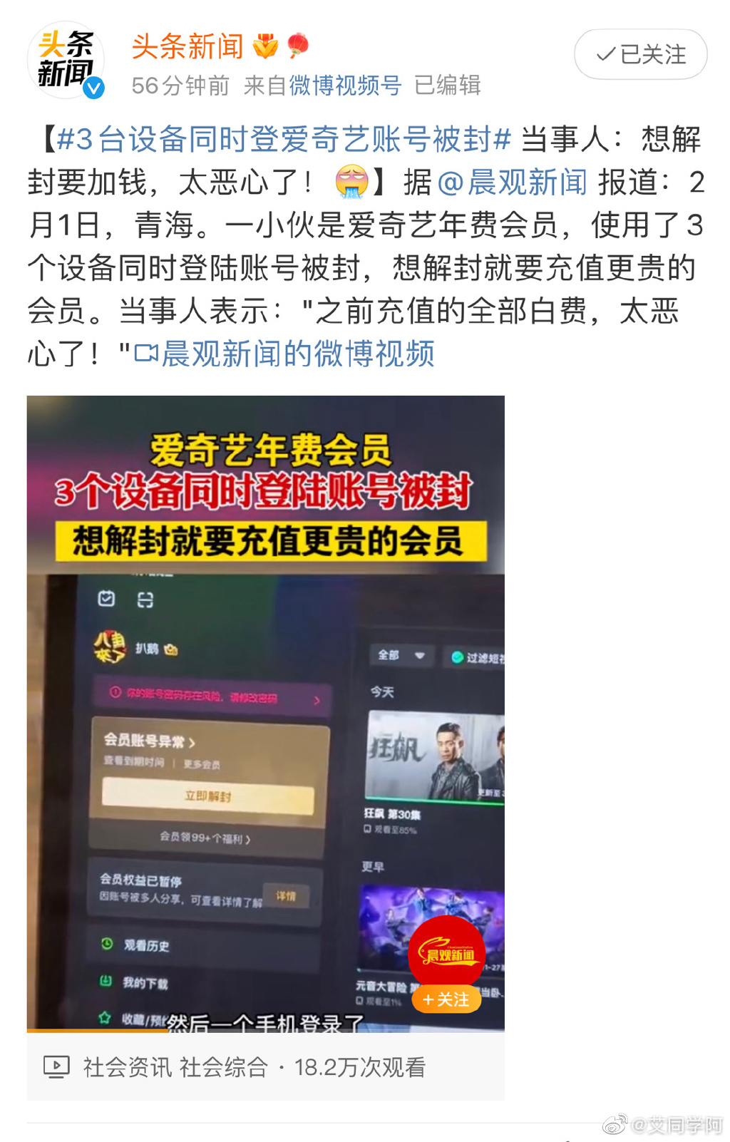 有爱奇艺年费会员称使用3台设备同时登陆致账号被封,想解封要充值更贵的会员。 导致账号被封和要求充值价格更高的会员一事,爱奇艺作出了回应: 这是由于超出设备限制导致被封,一般情况下修改密码即可解封,不存在需充值更贵会员才能解封的情况。另外,爱奇艺的会员账号不可自行借用、租用、售卖、分享、转让,若多台设备同时播放,可能触发安全拦截验证,验证通过可继续观看。 一般情况下修改密码即可解封,不存在需充值更贵会员才能解封的情况。