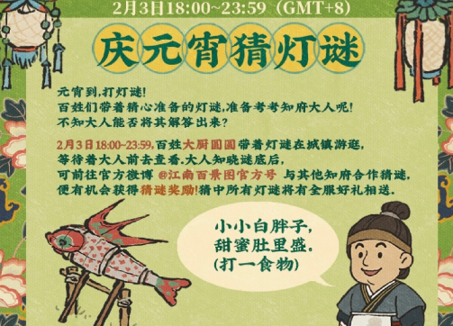 江南百景图游戏近期在微博开放了元宵节猜灯谜活动,在这个活动中玩家们需要猜对答案并且在官博评论留言才能够领取到相应奖励,下面就一起来看看今天的灯谜答案分享吧。