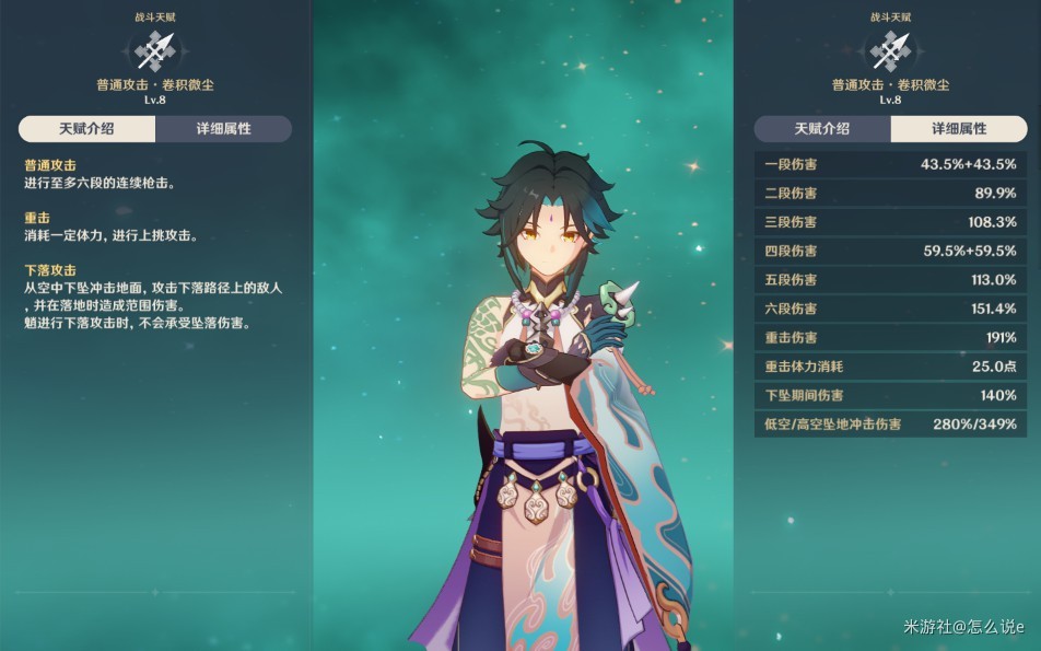 无明显后摇,第六段小后摇可以靠冲刺解决,重击消耗25点体力,对小体积怪物有击飞效果,但是普攻和重击依然不适合作为主要输出方式,哦,对了,魈普攻成长值比其他角色低些,仅为1.7(少了0.2)。