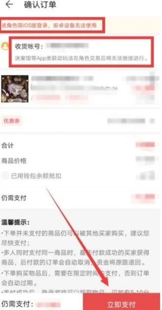 5. 挑选好后,点击【立即购买】即可,购买时注意操作系统,别安卓手机却购买了苹果系统的游戏号。