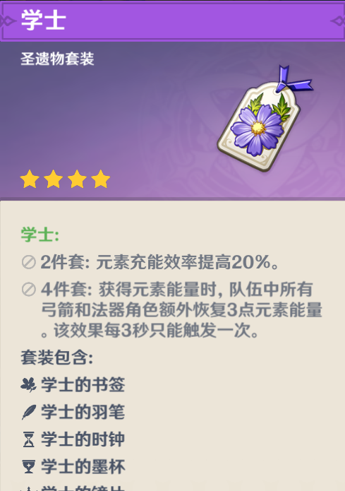 一、基础属性 2件套:元素充能效率提高20%。 4件套:获得元素微粒或元素晶球时,队伍中所有弓箭和法器角色额外恢复3点元素能量,该效果每3秒只能触发一次