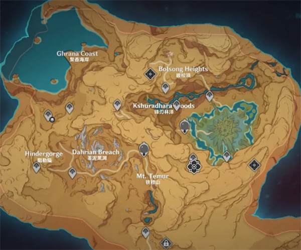 3.6新地图传送锚点: 3.6中的新地图是在千壑沙地的左上角一片。 这个地图会在3.6版本更新的时候上线,对应的传送点如下图所示,这两个七天神像间隔非常的小。