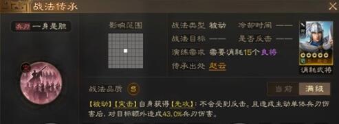 战法属性 战法类型:被动 冷却时间:—— 战法目标:—— 是否反击:—— 演练需求:需要消耗15个良将 传承出处:赵云