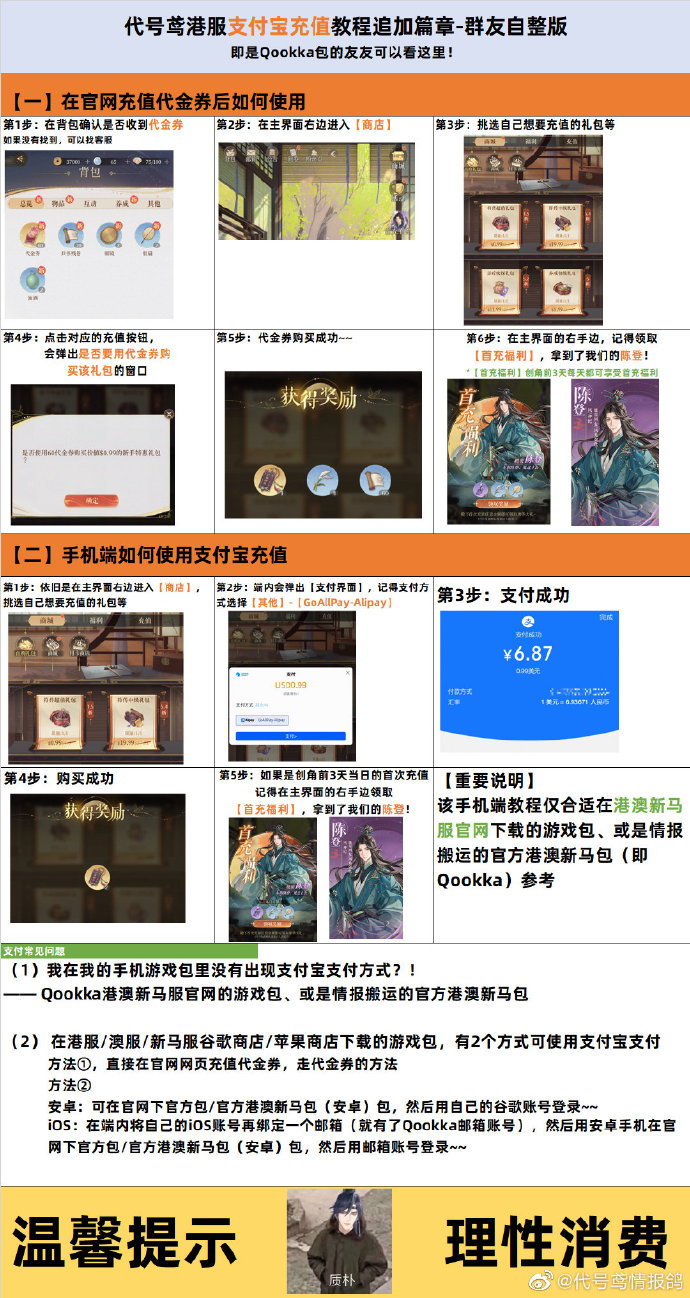 改名方法: 后面开了心纸君,就立马让你新起个名字了 此后主角再进行改名就需要使用道具 充值方法: 充值教程2.0版本,内容包含 【1】在官网充代金券后如何使用 【2】手机端如何使用支付宝充值 重要说明:该手机端教程仅适合港澳新马网下载的游戏包/或是情报鸽搬运的官方港澳新马包