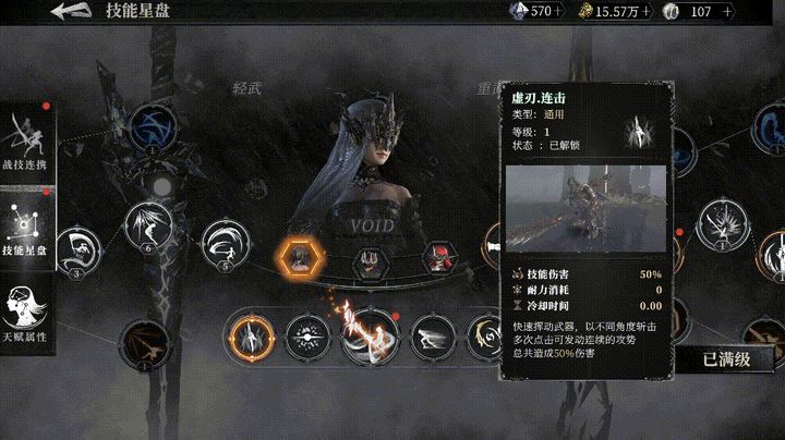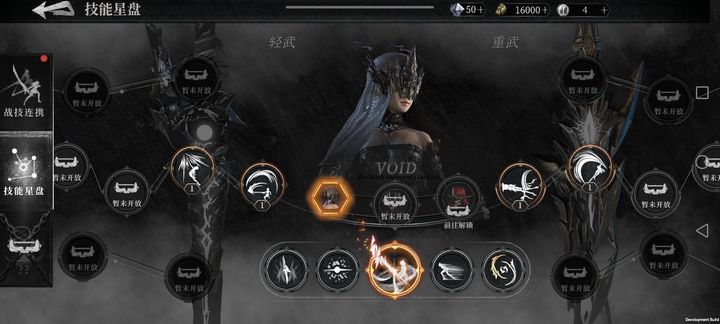 这是代行者·海拉的技能星盘,可以看到分有左右各一条线分别包含了海拉所有可以学习和使用的轻武器和重武器技能。