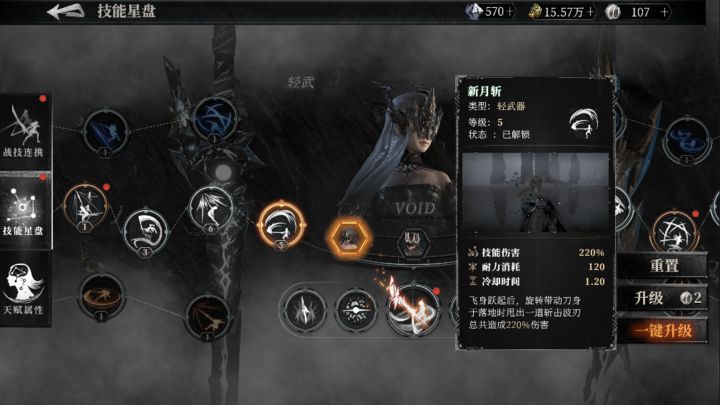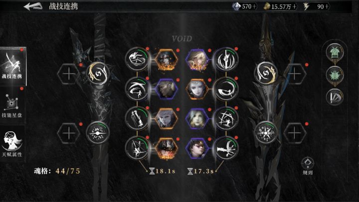 点击星盘内技能图标,可以看到技能描述。升级技能可以提升技能伤害,重置可免费返还所有技能点。在战技连携内完成装配之后可以看到已装配的技能链以及技能上附带的魂核。