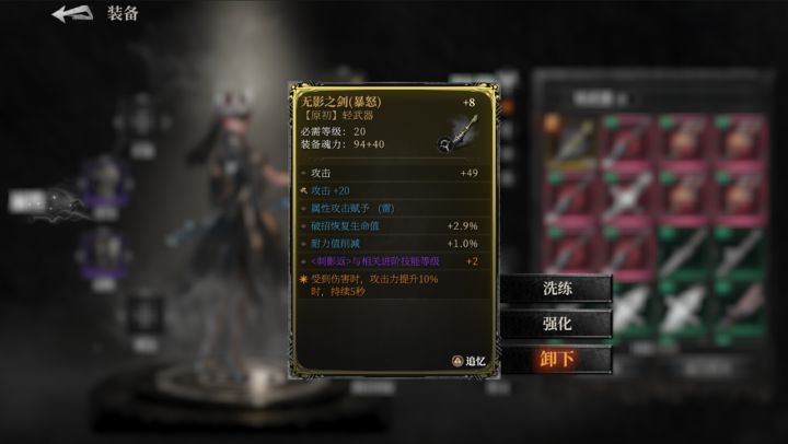 武器选择推荐这把无影之剑(暴怒),固定词条是受到伤害提升攻击10%持续5s,海拉作为一个近战配上这个词条能大幅提高海拉的输出,其他随机的词条有雷属性攻击,提升刺影返技能等级,都很契合海拉。