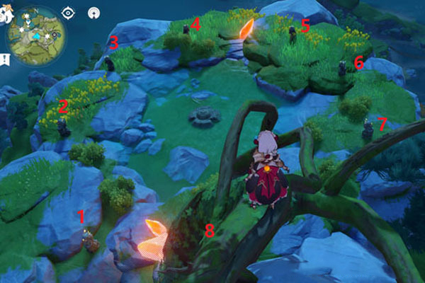 具体攻略: 1、需要前往轻策庄最高的山峰处。 2、登上山顶后就可以看到前方的一棵大树,按照大树上的位置分别标记了8个点。
